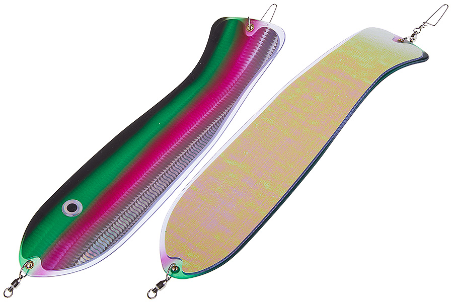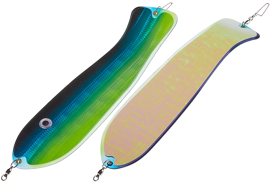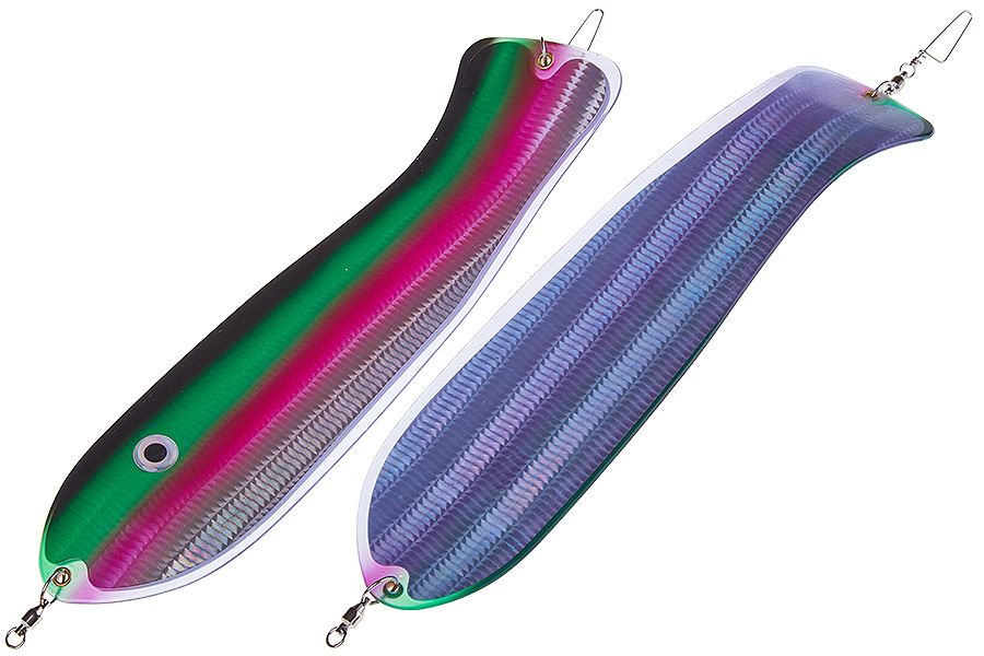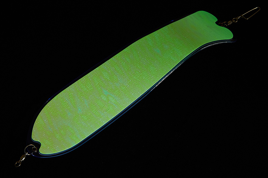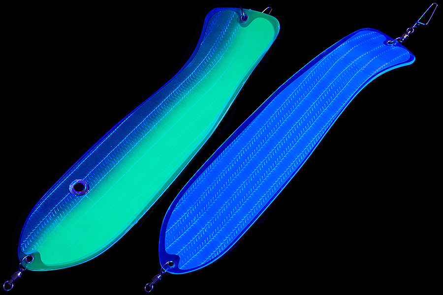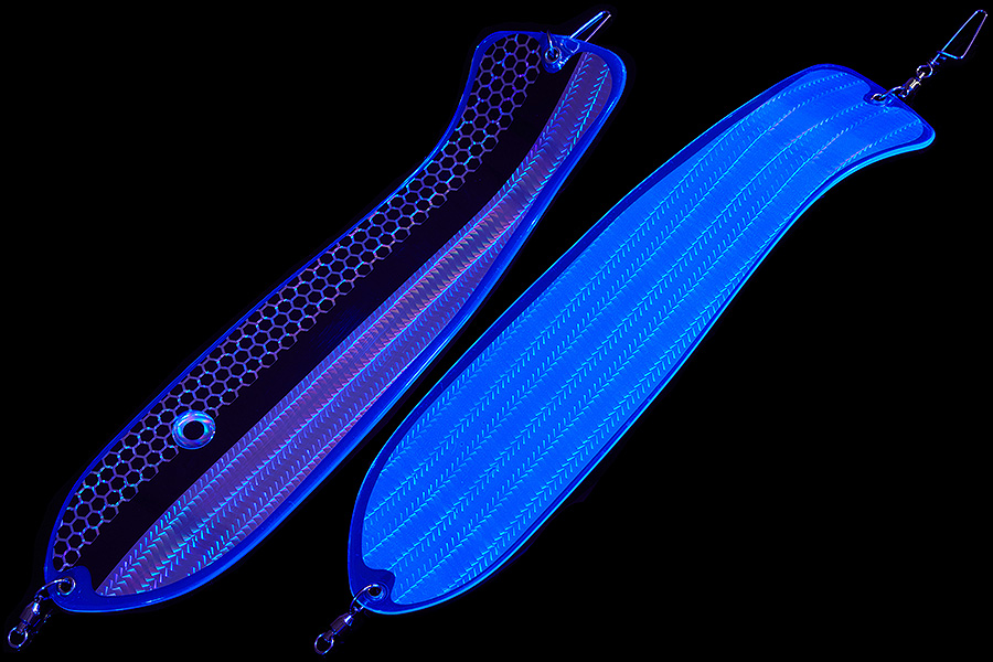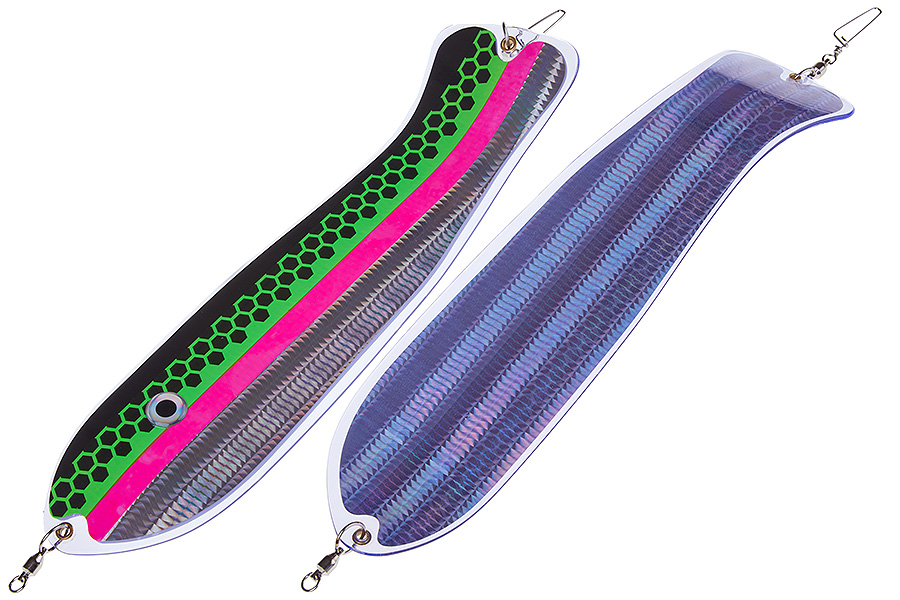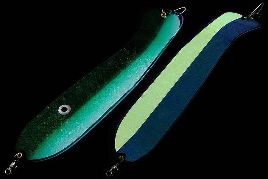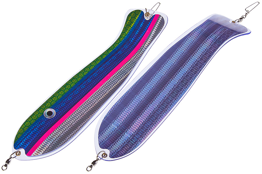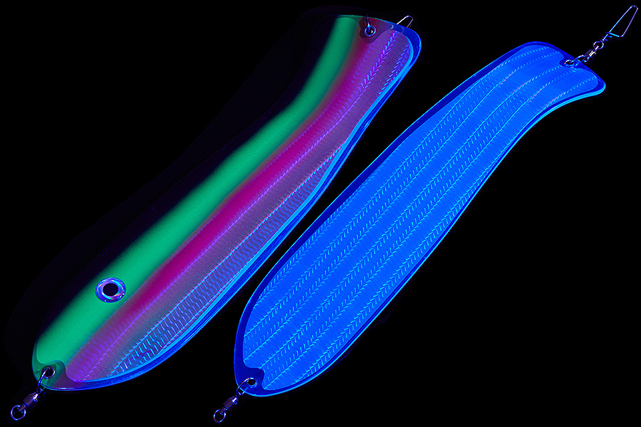 Флешер в форме рыбы прекрасно привлекает лосося на расстоянии. При изготовления тела флешера используется пластик с добавлением пигмента, который светится голубым в ультрафиолете (при дневном солнечном свете). Различные по цветам наклейки предназначены для разнобразных погодных условий. Светонакопительные для утра или пасмурной погоды, также они могут работать в мутной воде. Флуоресцентные цвета могут хорошо работать в солнечные дни. Качественная морская фурнитура позволит ловить не опасаясь за потерю снастей.