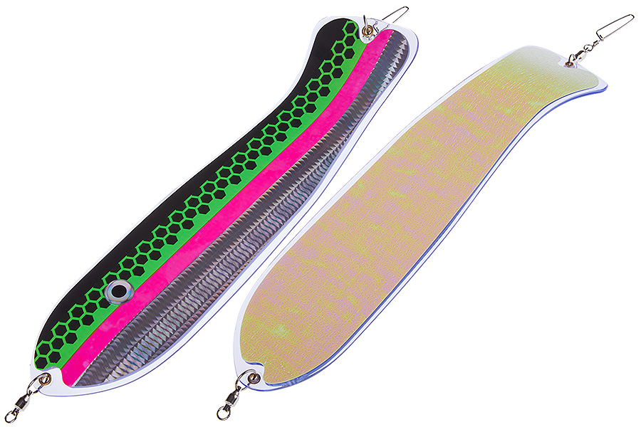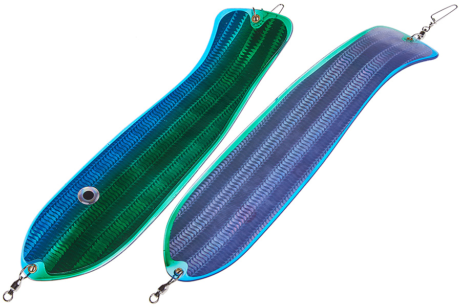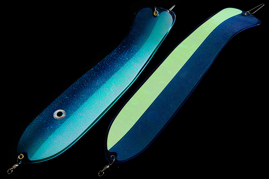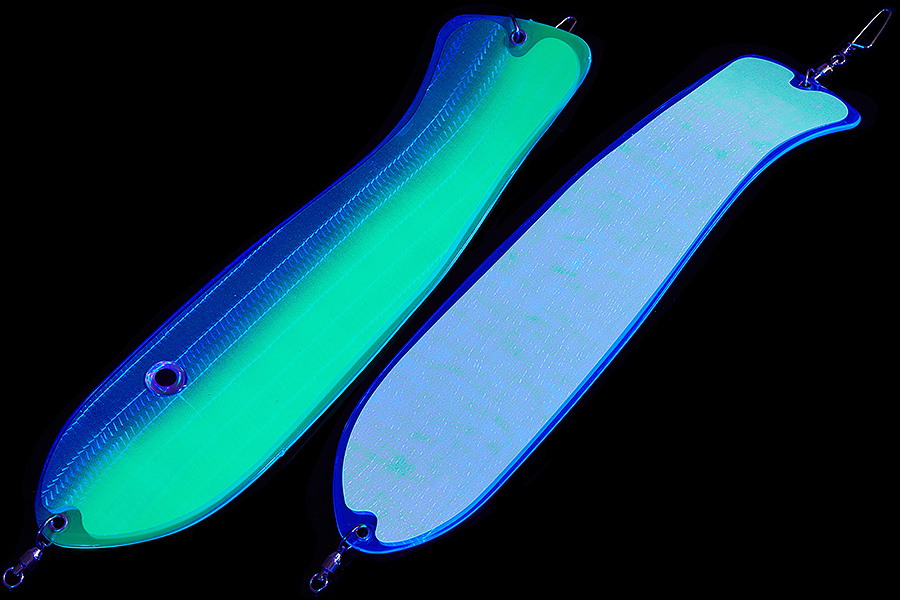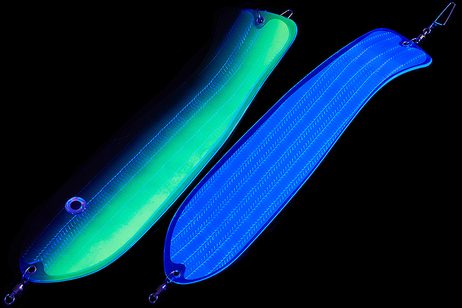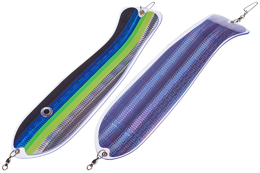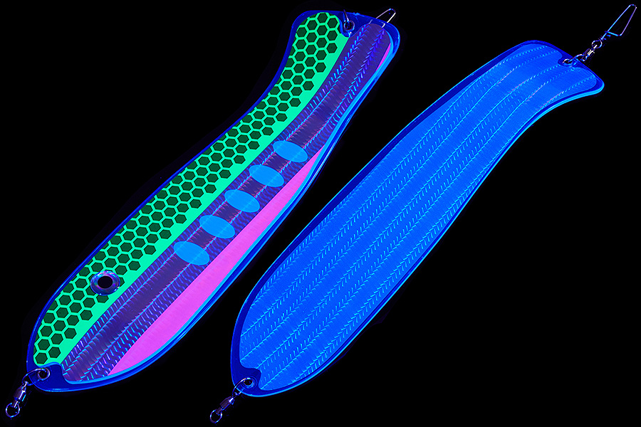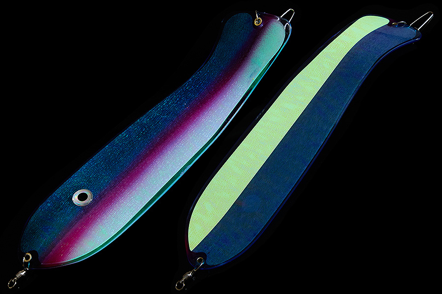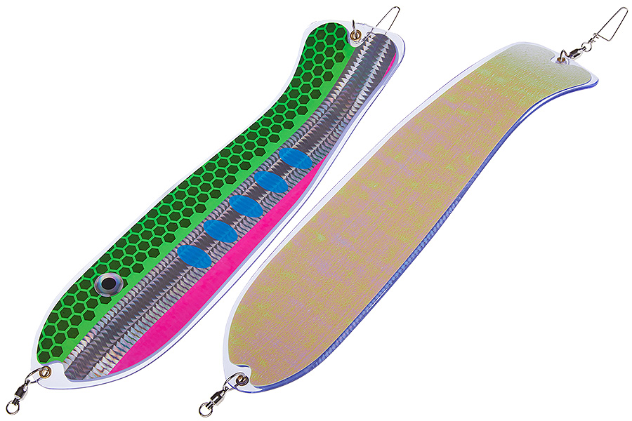 Флешер в форме рыбы прекрасно привлекает лосося на расстоянии. При изготовления тела флешера используется пластик с добавлением пигмента, который светится голубым в ультрафиолете (при дневном солнечном свете). Различные по цветам наклейки предназначены для разнобразных погодных условий. Светонакопительные для утра или пасмурной погоды, также они могут работать в мутной воде. Флуоресцентные цвета могут хорошо работать в солнечные дни. Качественная морская фурнитура позволит ловить не опасаясь за потерю снастей.