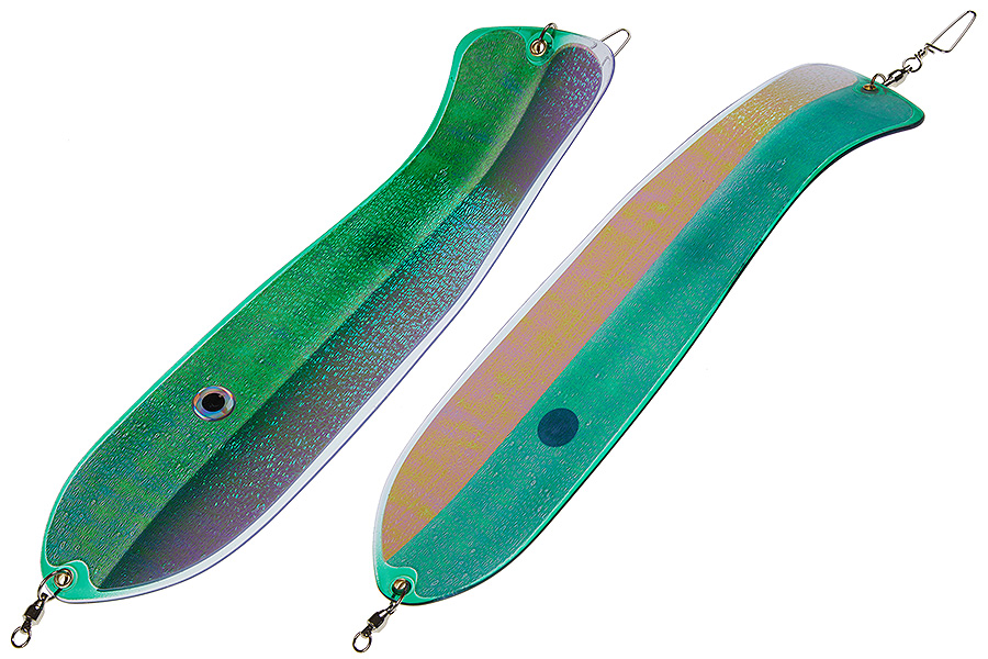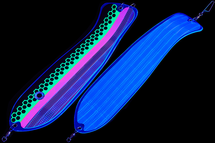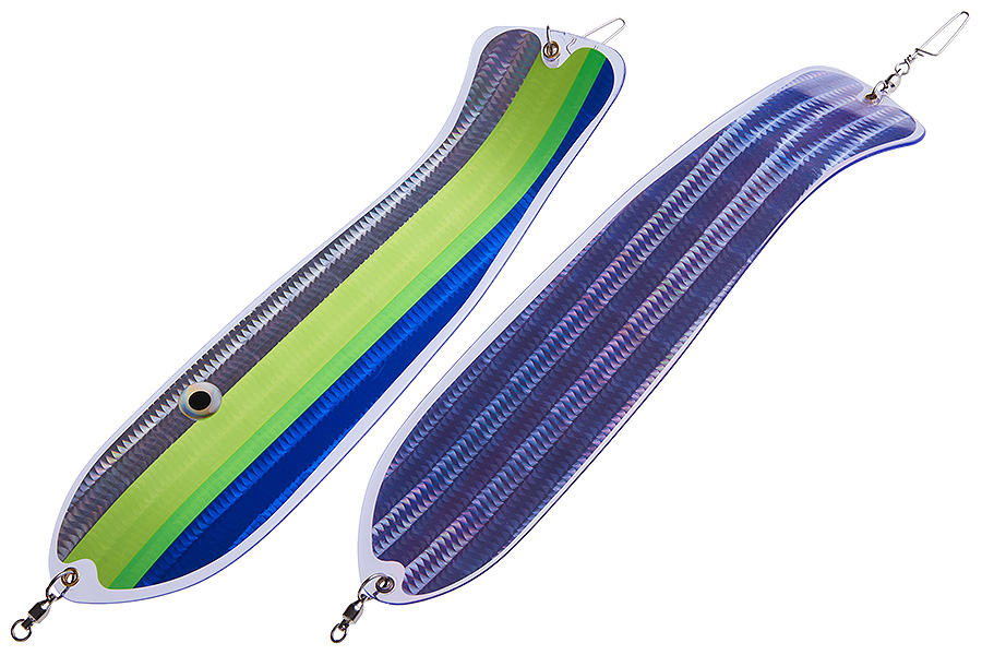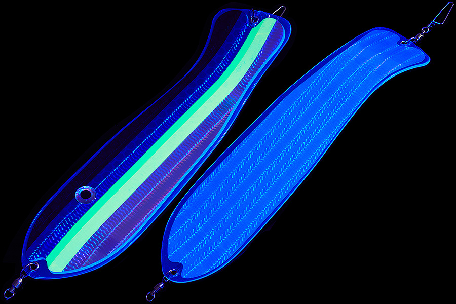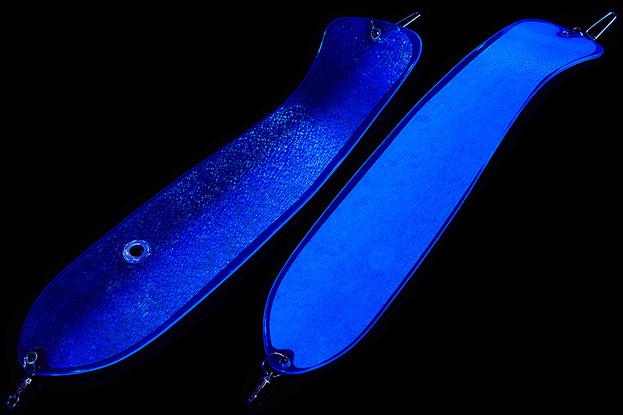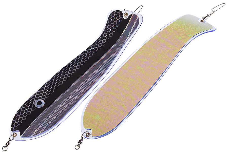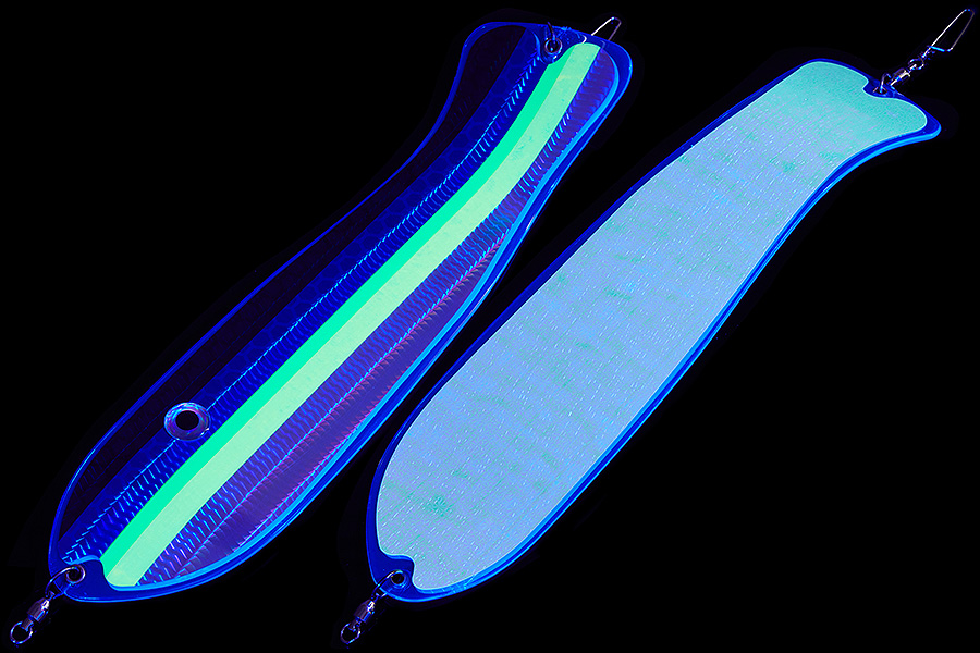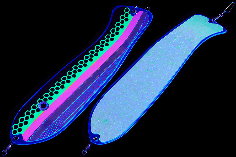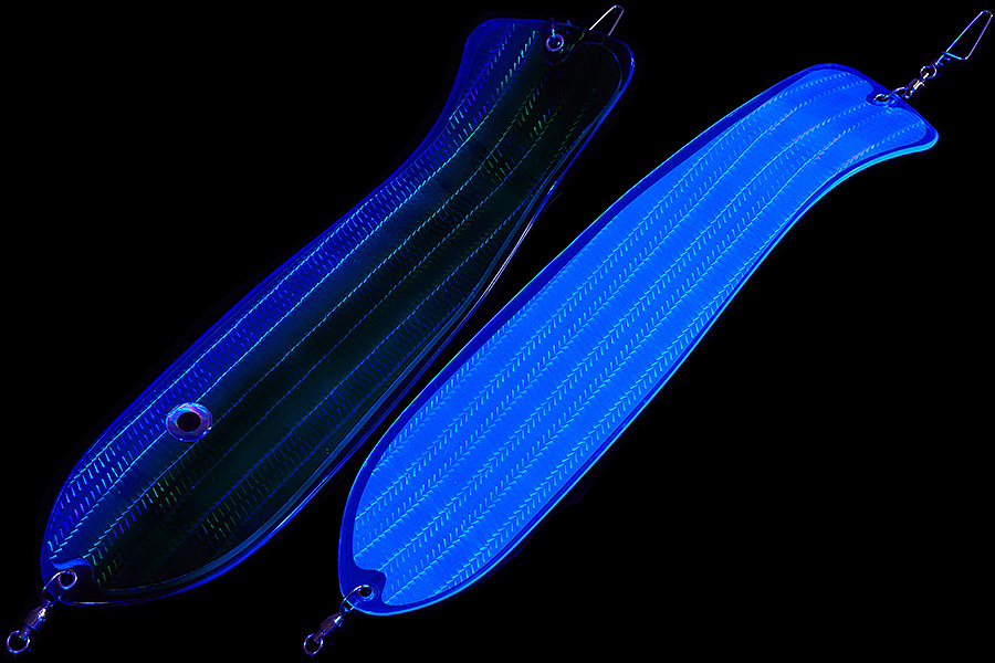 Флешер в форме рыбы прекрасно привлекает лосося на расстоянии. При изготовления тела флешера используется пластик с добавлением пигмента, который светится голубым в ультрафиолете (при дневном солнечном свете). Различные по цветам наклейки предназначены для разнобразных погодных условий. Светонакопительные для утра или пасмурной погоды, также они могут работать в мутной воде. Флуоресцентные цвета могут хорошо работать в солнечные дни. Качественная морская фурнитура позволит ловить не опасаясь за потерю снастей.